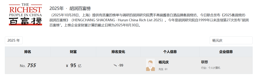 2025年胡润百富榜显示,杨元庆以95亿元人民币财富位列该榜单第755位。